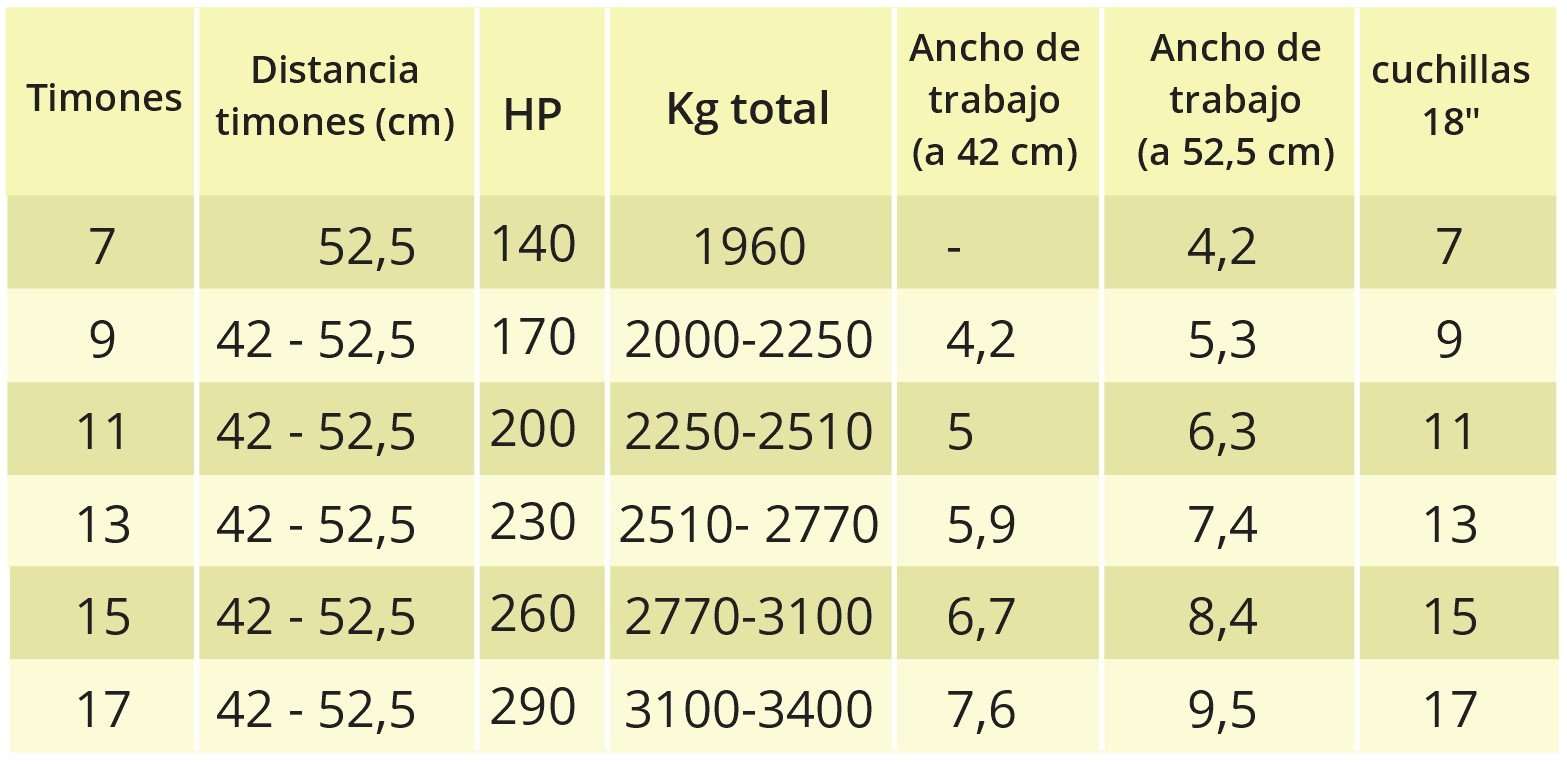 Rolos: Sellan los surcos generados por los timones, desterronan y dan buena terminación al trabajo, de 300 mm de diámetro, construidos en acero redondo de 15,8 mm montados sobre rodamientos laterales. Cuentan con resortes que generan presión, dando mejor terminación de la superficie.