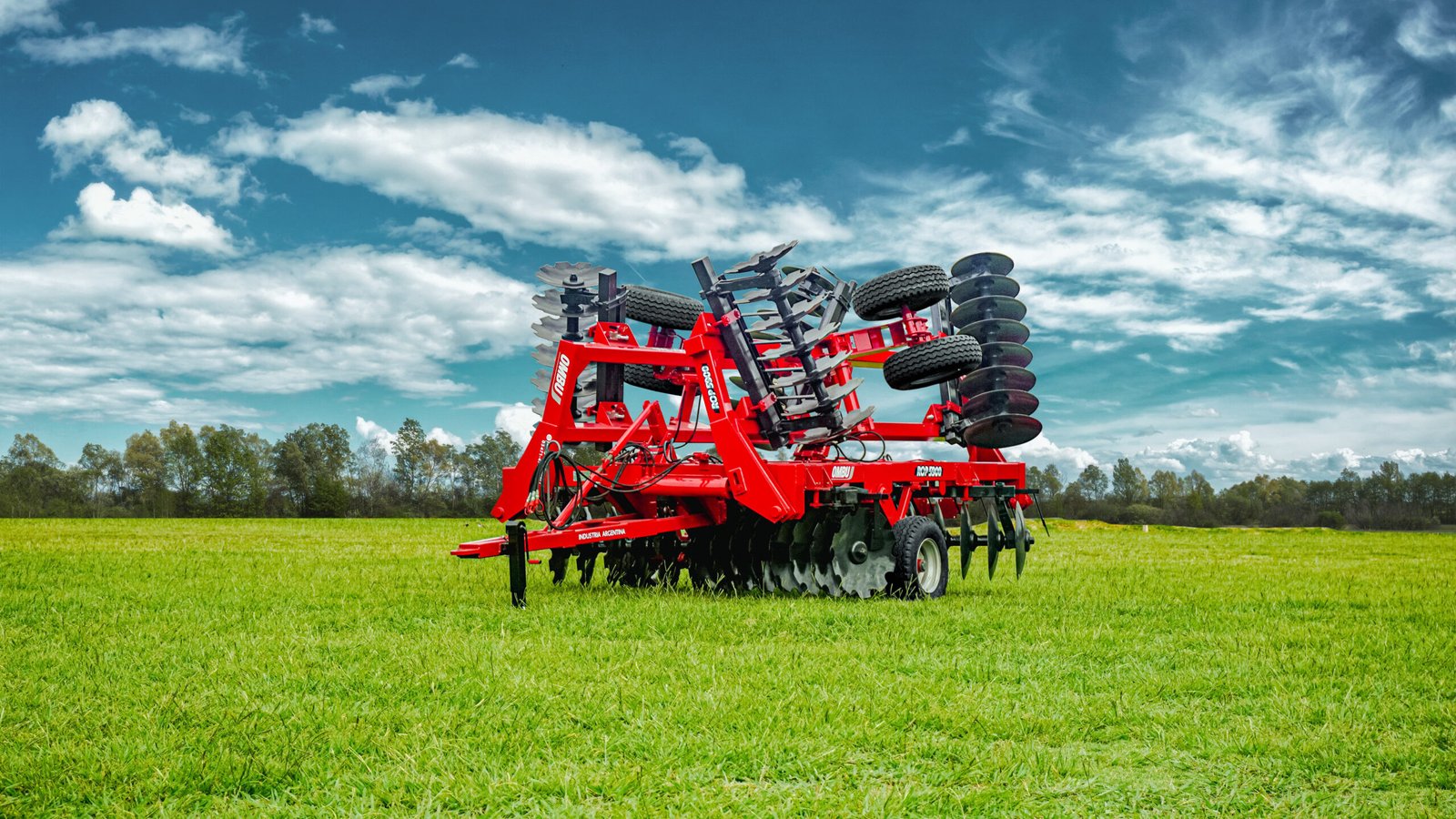 Chasis: fabricado con tubos de 160 x 120 mm lo cual le brinda un correcto funcionamiento en cualquier terreno. Disponible en modelos de 48 a 72 discos. Peso por disco: 104Kg. Regulación del chasis: manual, por medio de manivela. Lanza de tiro: con rotula tratado térmicamente en la punta de la lanza. Su diseño le brinda un óptimo radio de giro, facilitando las maniobras tanto en la operación como en transporte. Sistema de balancín: está ubicado en la parte central y montado sobre rodillos cónicos. En rastras mayores a 60 discos se provee el sistema en las alas. Sistema hidráulico: cuenta con cuatro cilindros distribuidos en el panel central, las alas y el control de profundidad. Dos cilindros más son los encargados de poner a la rastra en posición de transporte. Transporte: con solo accionar el sistema hidráulico de las alas, la rastra pasa de posición de trabajo a posición de transporte. Además cuenta con un sistema de trabas que le otorga mayor estabilidad y seguridad.